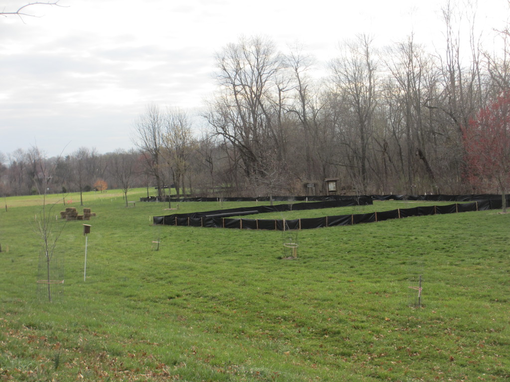 Construction of the shared-use path connecting Waterford and Baker Parks has begun. The required black fence to protect the waterways from runoff and the L.O.D. stakes (limit of disturbance) are in place. The paved path will be replaced with a semi-permeable path that is 10 feet wide. The path will be extended to Carroll Creek where an 80 foot bridge will cross the creek. The low spot at the bend near the benches will be altered so we do not have pools of water and ice there. The construction of the tunnel under the ramp from Rosemont to Rt. 15 is scheduled for early May. That ramp will be closed for as short a time as possible. The path will then connect to the existing concrete path at Rosemont. Trees with white X’s will be removed. Trees with orange tape will be moved. (Top picture shows a staging area; bottom picture looks toward Carroll Creek where the bridge will go).